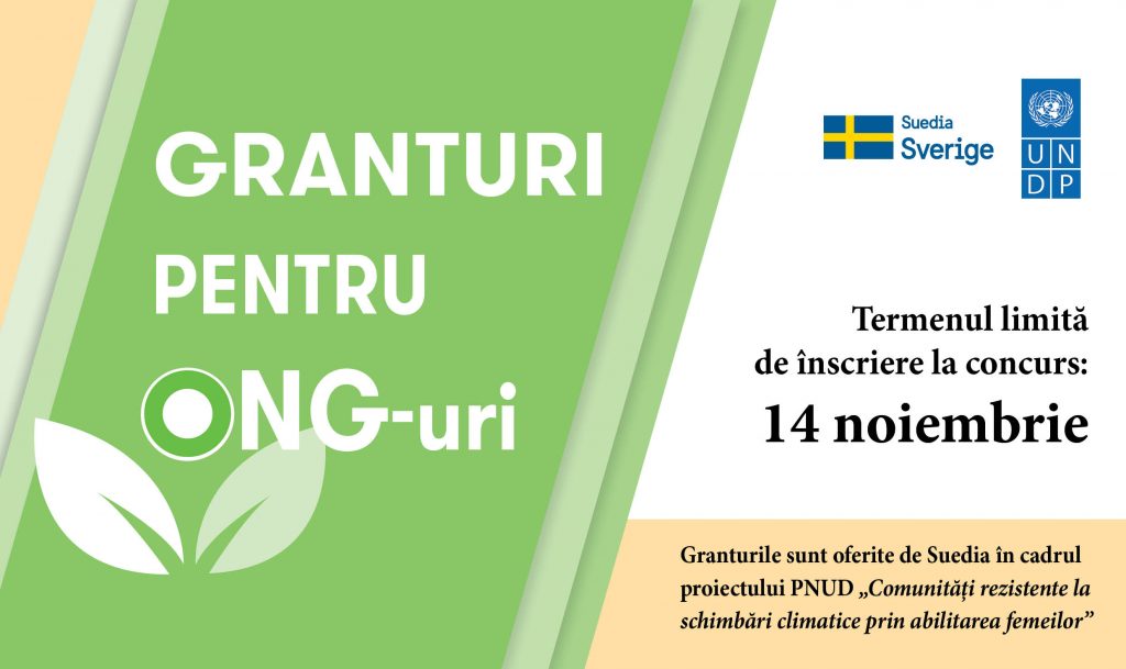 Proiectul PNUD ”Comunități rezistente la schimbări climatice prin abilitarea femeilor”, cu asistența financiară a Suediei, a lansat un nou concurs de granturi pentru ONG-urile din domeniul mediului, dezvoltării locale, schimbări climatice sau alte domenii conexe.