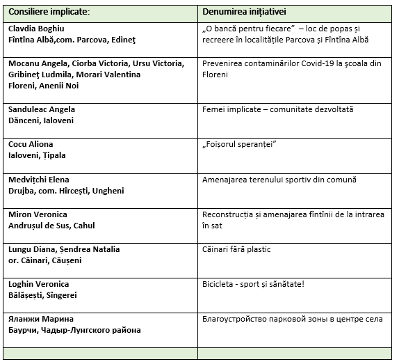 La concurs au fost înregistrate peste 70 de inițiative locale înaintate de participantele Programului, iar în rezultatul evaluării acestora, comisia de selecție a numit cele 27 inițiative câștigătoare. Inițiativele selectate urmează a fi implementate până la sfârșitul anului 2020.