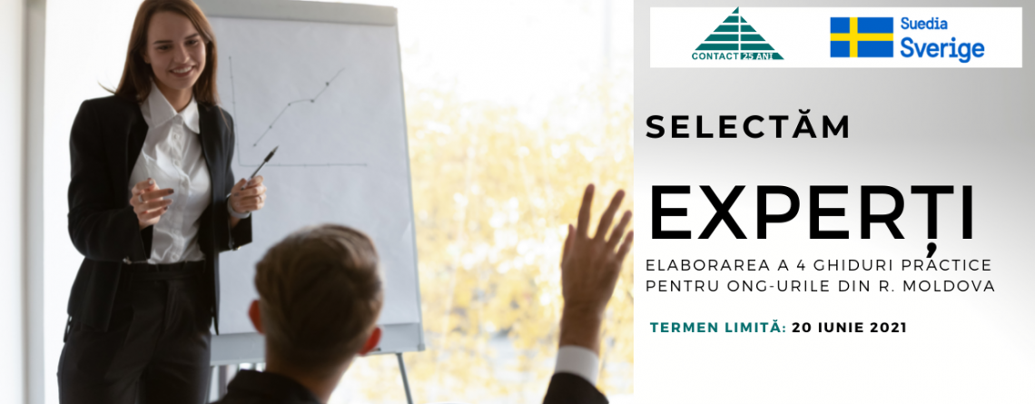Centrul CONTACT în cadrul Programului de suport instituțional pentru dezvoltarea organizației, finanțat de Suedia, anunță concurs pentru elaborarea a 4 ghiduri practice (tutoriale) pentru ONG-urile din Republica Moldova, inclusiv UTA Găgăuzia și regiunea transnistreană.