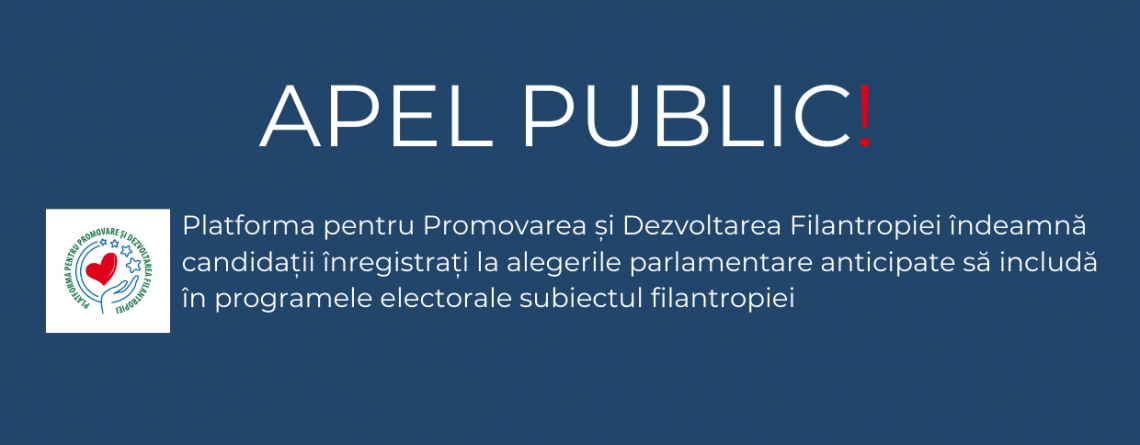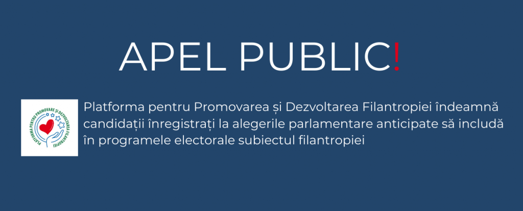 APEL PUBLIC: Platforma pentru Promovarea și Dezvoltarea Filantropiei îndeamnă candidații înregistrați la alegerile parlamentare anticipate să includă în programele electorale subiectul filantropiei