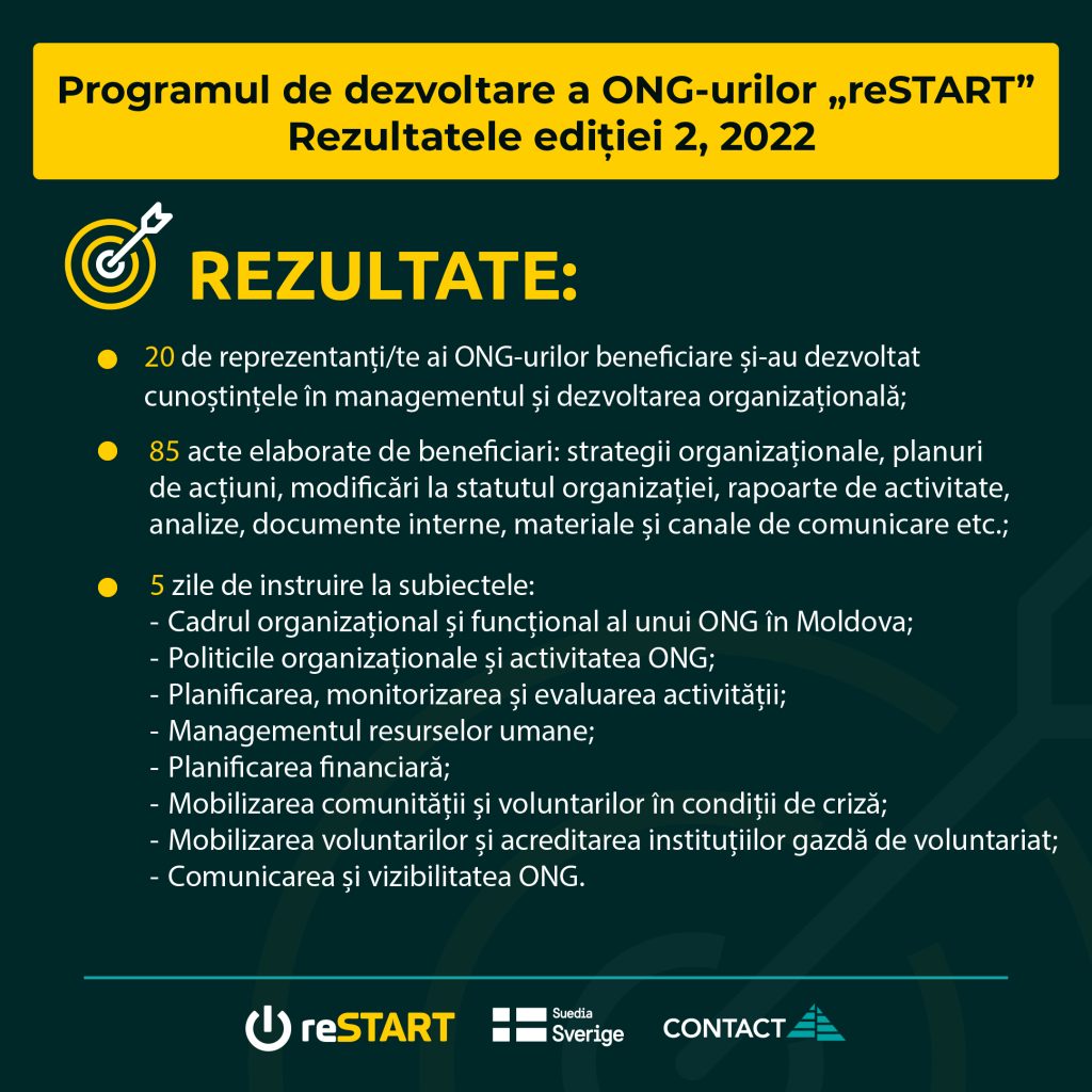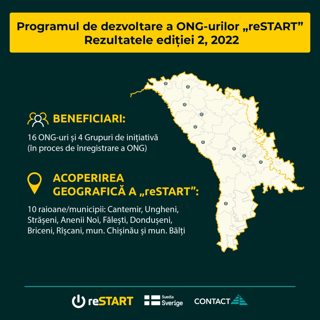 Programul de dezvoltare al ONG-urilor „reSTART”, ediția II, este implementat de Centrul CONTACT, cu suportul financiar al Suediei.
