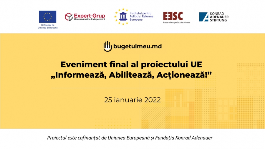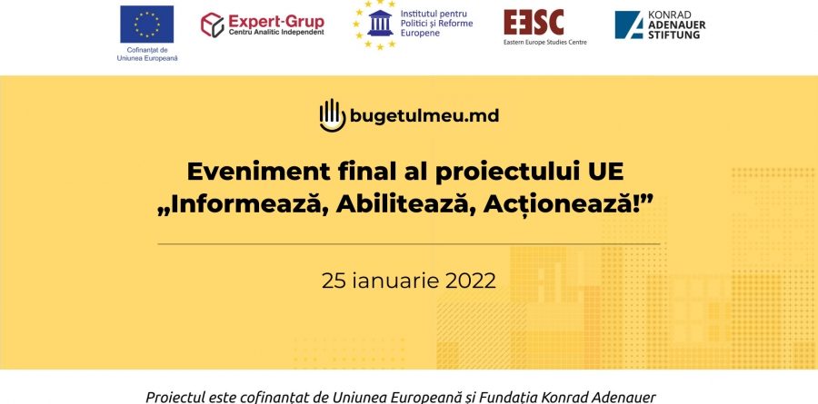 Grație proiectului „Bugetul Meu”, au fost realizate 135 de proiecte de bugetare participativă în 25 de localități – acestea și alte rezultate majore ale proiectului „Informează, abilitează și acționează! Societatea civilă pentru o bună guvernare bugetară în Moldova” au fost prezentate în cadrului evenimentului de totalizare organizat, pe 25 ianuarie 2022, de către Centrul Analitic Independent „Expert-Grup”, în parteneriat cu Institutul pentru Politici și Reforme Europene (IPRE) și Centrul de Studii Est Europene (EESC, Lituania), cu suportul financiar al Uniunii Europene și Fundației Konrad Adenauer.