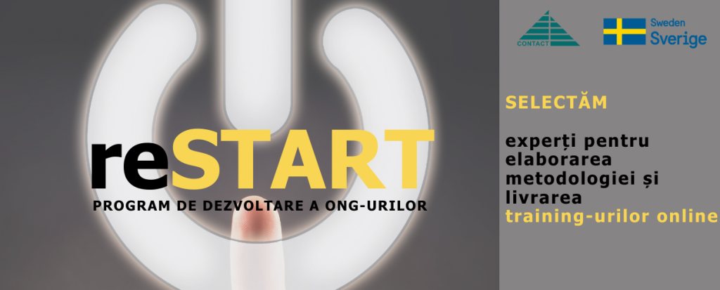 Centrul CONTACT în cadrul Programului de suport instituțional pentru dezvoltarea organizației, finanțat de Suedia, anunță concurs pentru selectarea unui expert/experte sau grup de experți în elaborarea metodologiei și livrarea training-urilor online în cadrul programului de dezvoltare a ONG-urilor:„reSTART pentru ONG-urile din Republica Moldova”